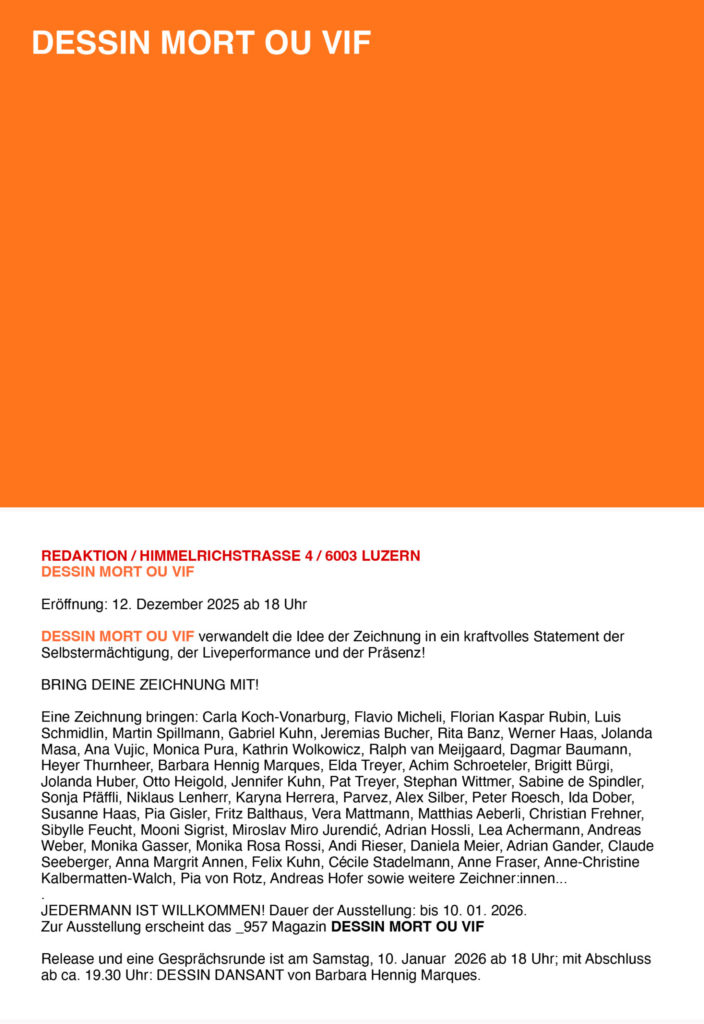 The group show DESSIN MORT OU VIF at Redaktion, Lucern/SUI transforms the idea of drawing into a powerful statement of self-empowerment, live performance, and presence!